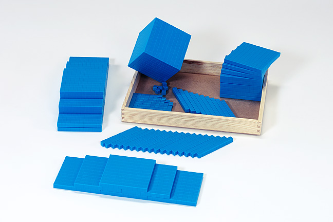 A full set of Montessori decimal material, including 100 unit cubes, 27 ten rods,